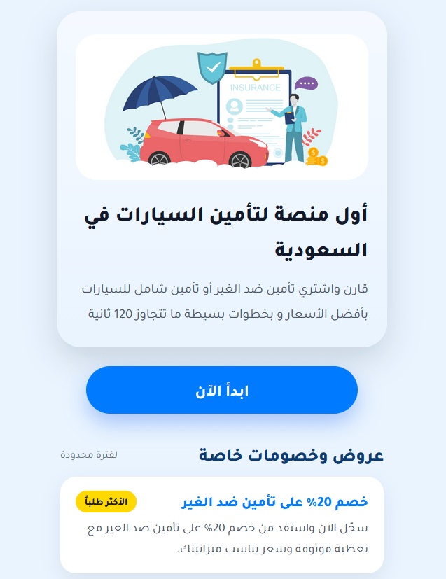 منصة متخصصة في تزويد الأفراد والشركات بعروض أسعار تأمينية من عدة شركات مرخصة، بطريقة سريعة، شفافة، ومقارنة سهلة. نهدف إلى تمكين العملاء من اختيار التأمين الأنسب لاحتياجاتهم، سواء كان تأمين سيارات، صحي، ممتلكات، أو غيره، مع الحفاظ على خصوصية معلوماتهم وسهولة الوصول إلى أفضل الخيارات
